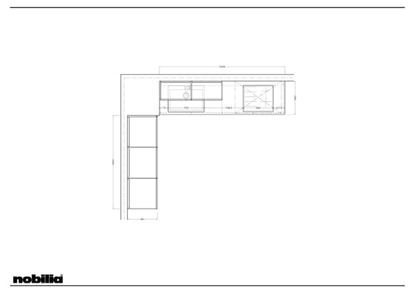 柱やパイプスペースによってできた角を挟んで分割されたL型のキッチンをレイアウトしました。